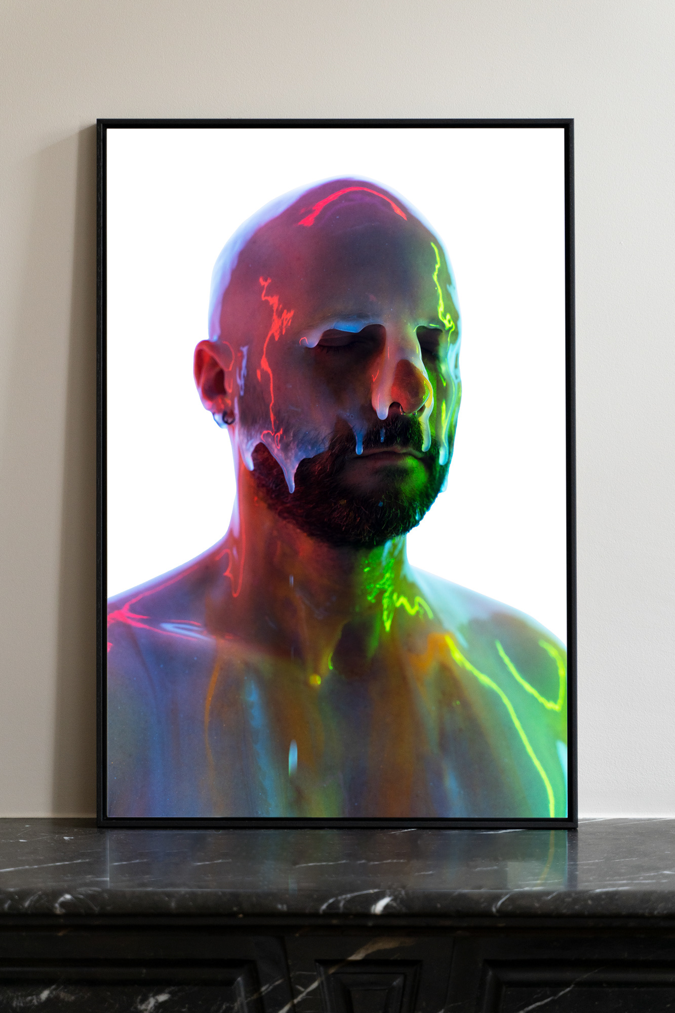 The artwork is presented in an elegant black American-style frame, offering a contemporary, gallery-quality presentation that gives the piece a strong visual and sculptural presence.